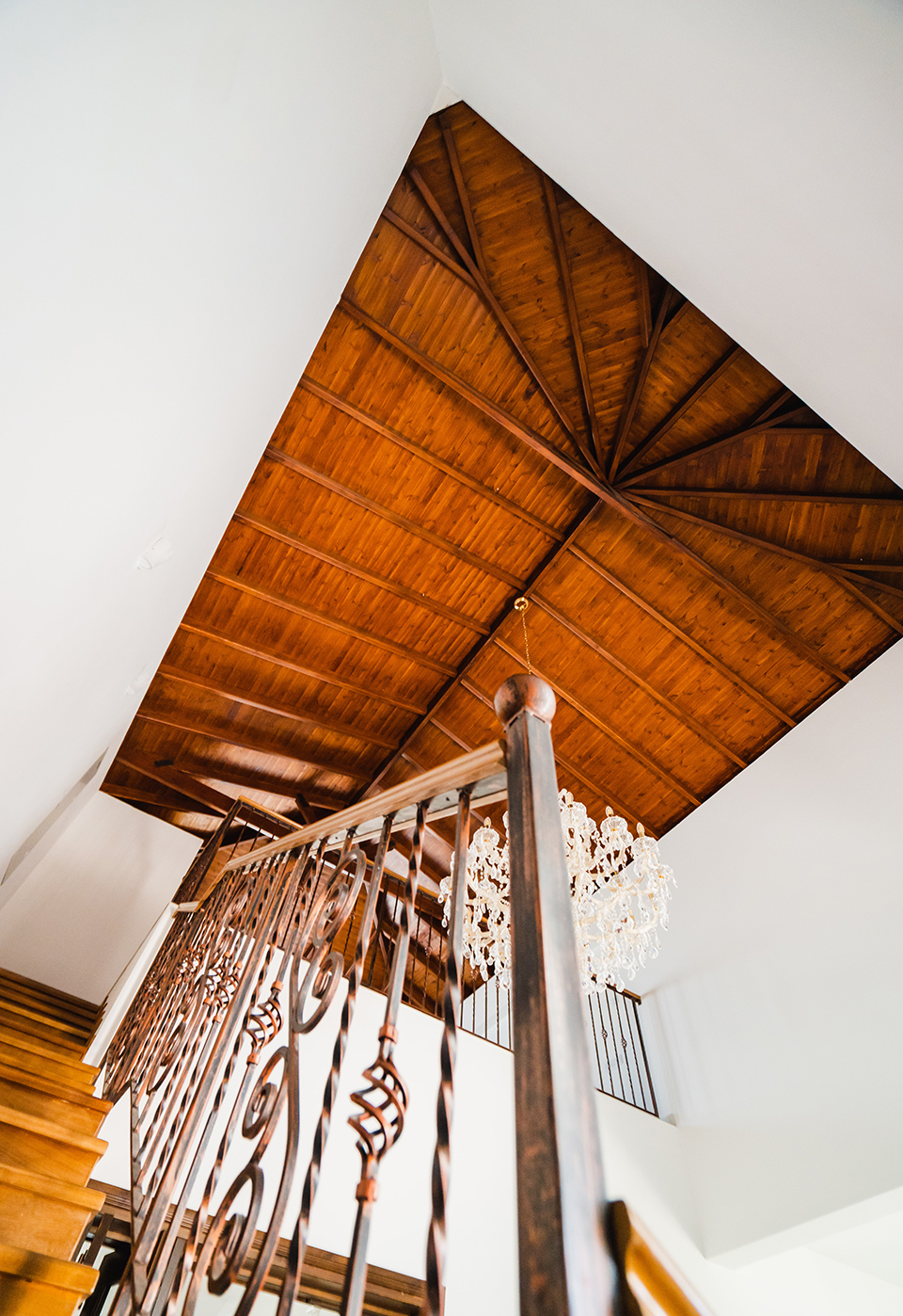 The solid iroko staircase stands out in the living room, with a handcrafted wooden ceiling that covers the entire space.