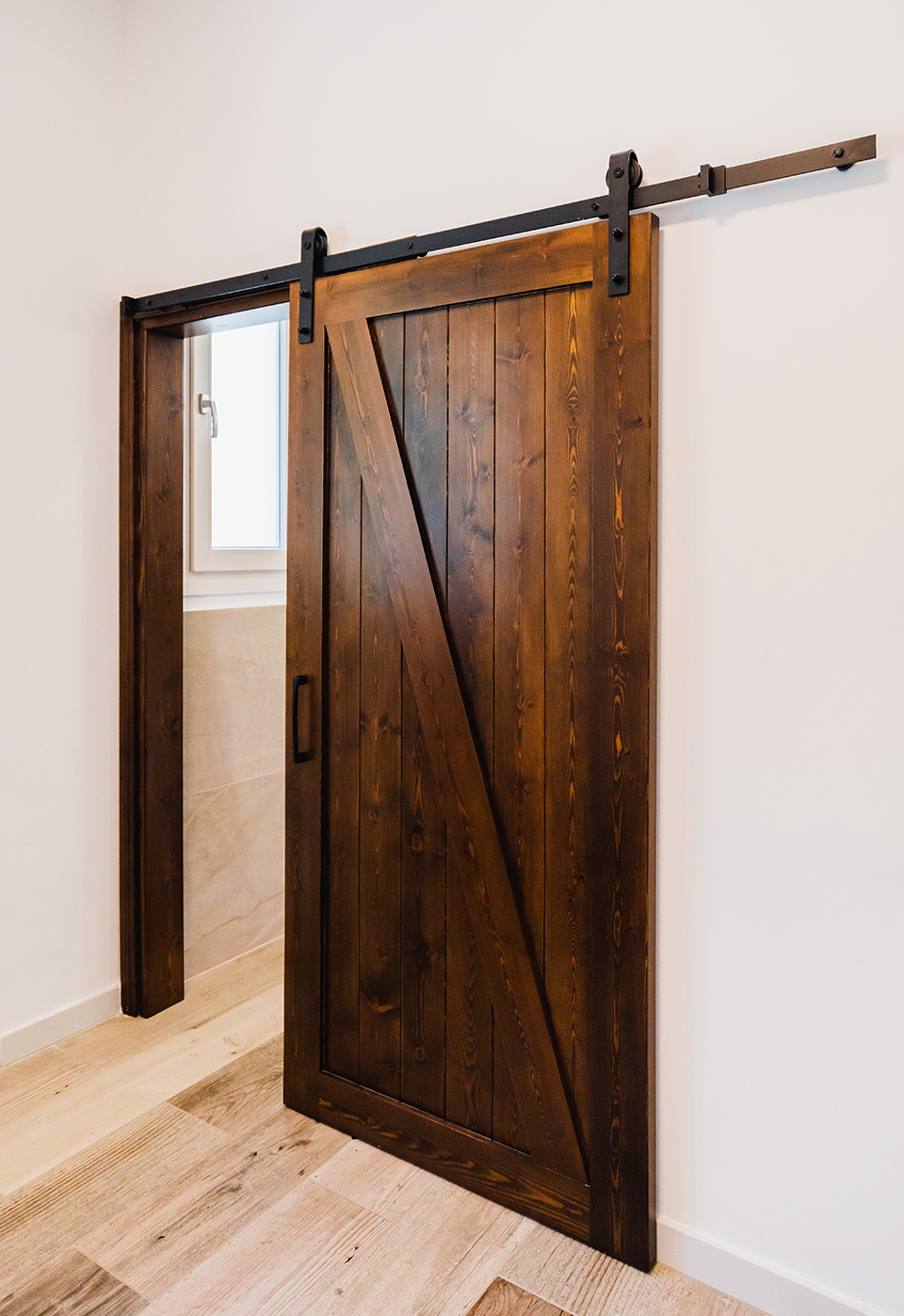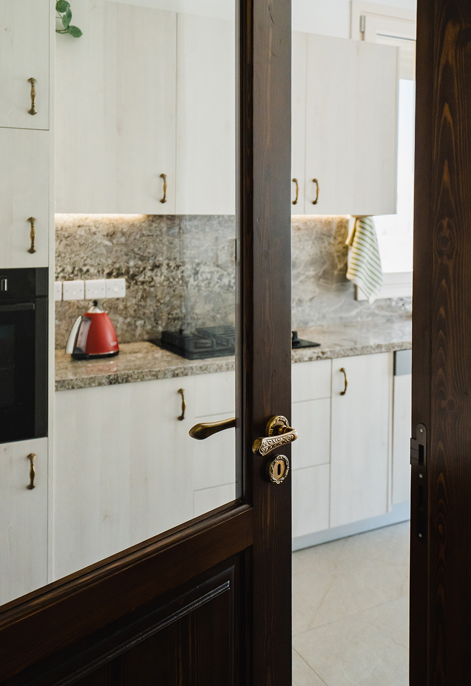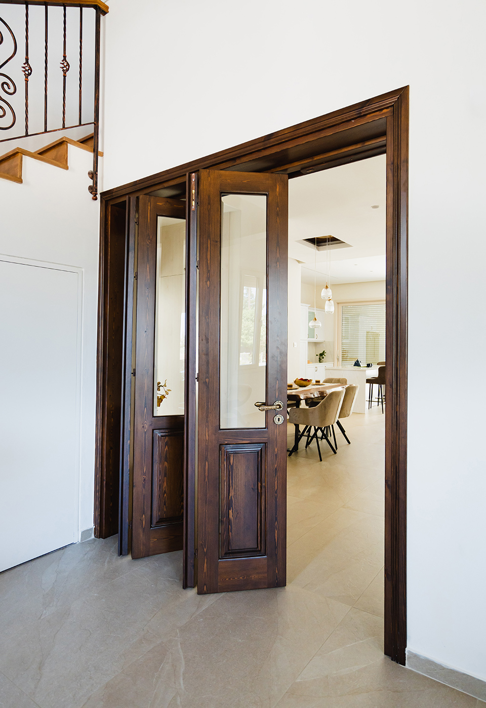 A four-panel folding door, made of solid pine wood, with a warm brown lacquer and semi-gloss finish, separates the kitchen from the living room.