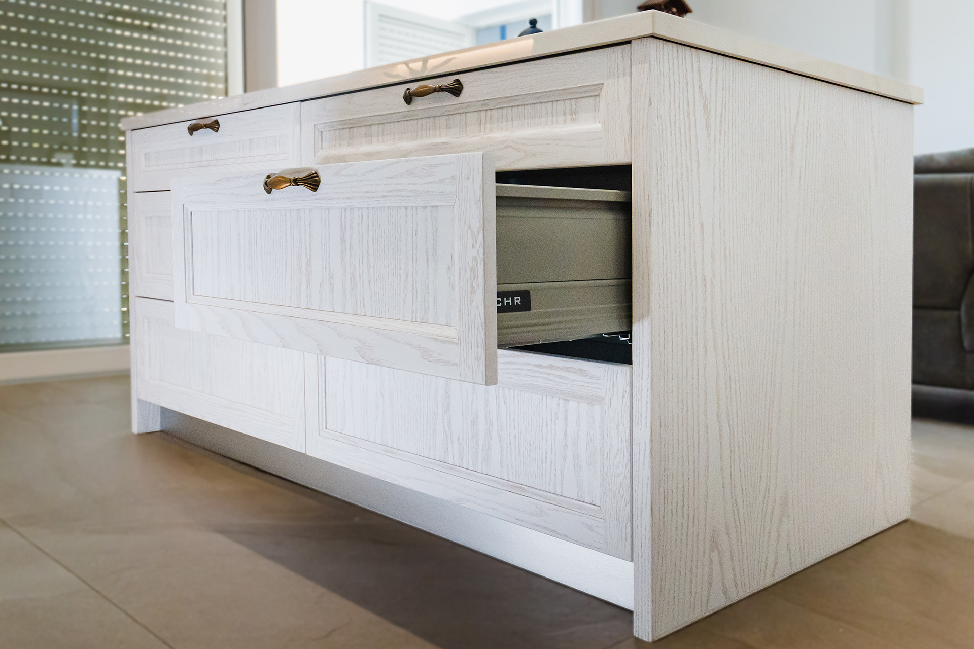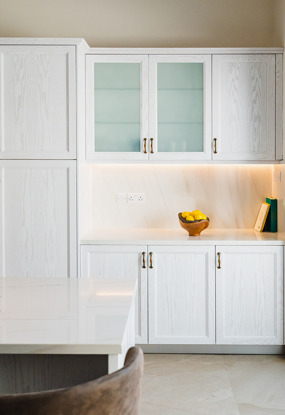 The “I”-shaped kitchen with an island has a clean, timeless design. Made from solid oak wood with a white lacquered matte finish, it features a smooth white countertop and under-cabinet lighting that highlights the backsplash. Brass handles add a touch of elegance. The layout is functional, simple, and stylish, making it a great space for cooking and gathering.