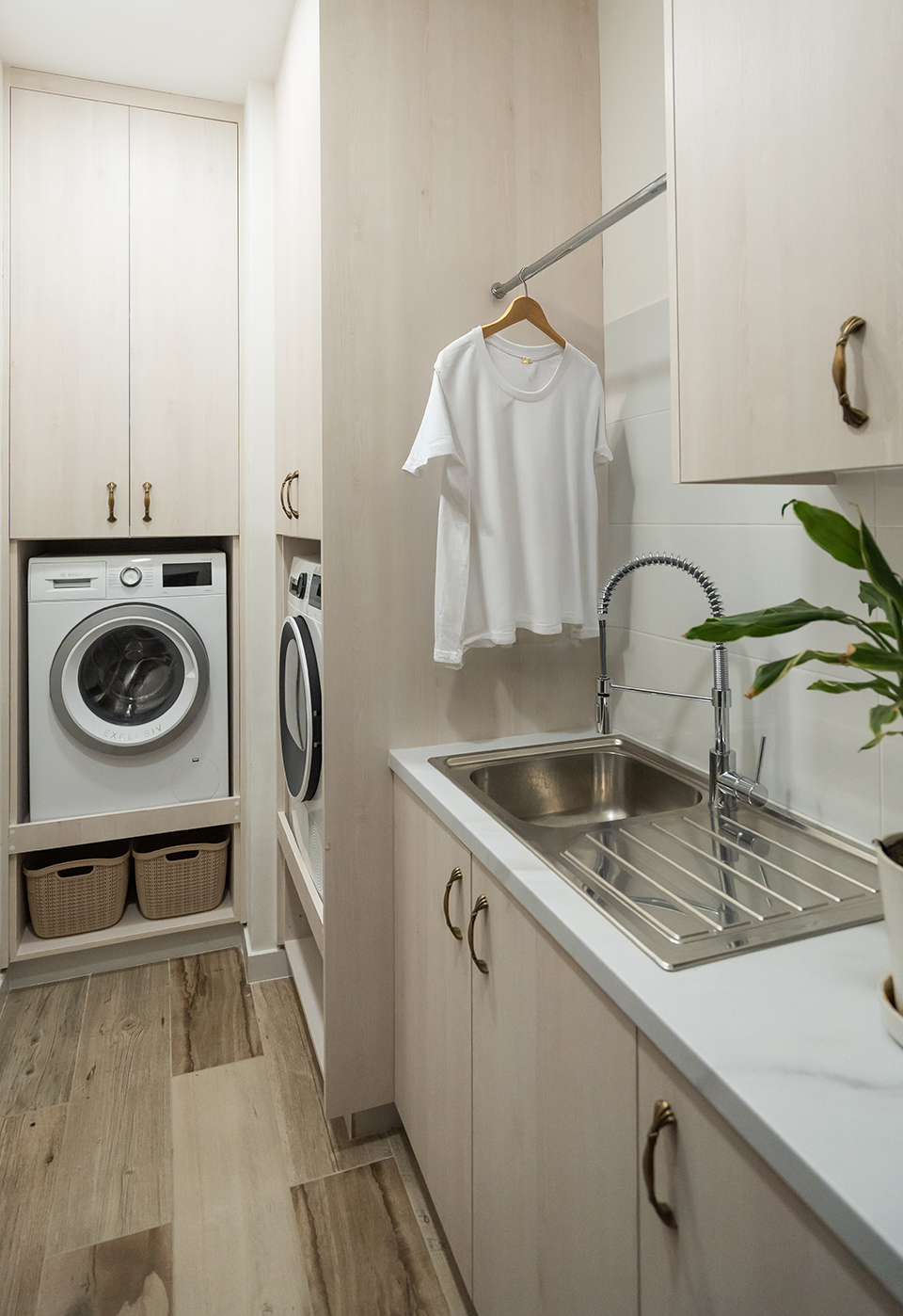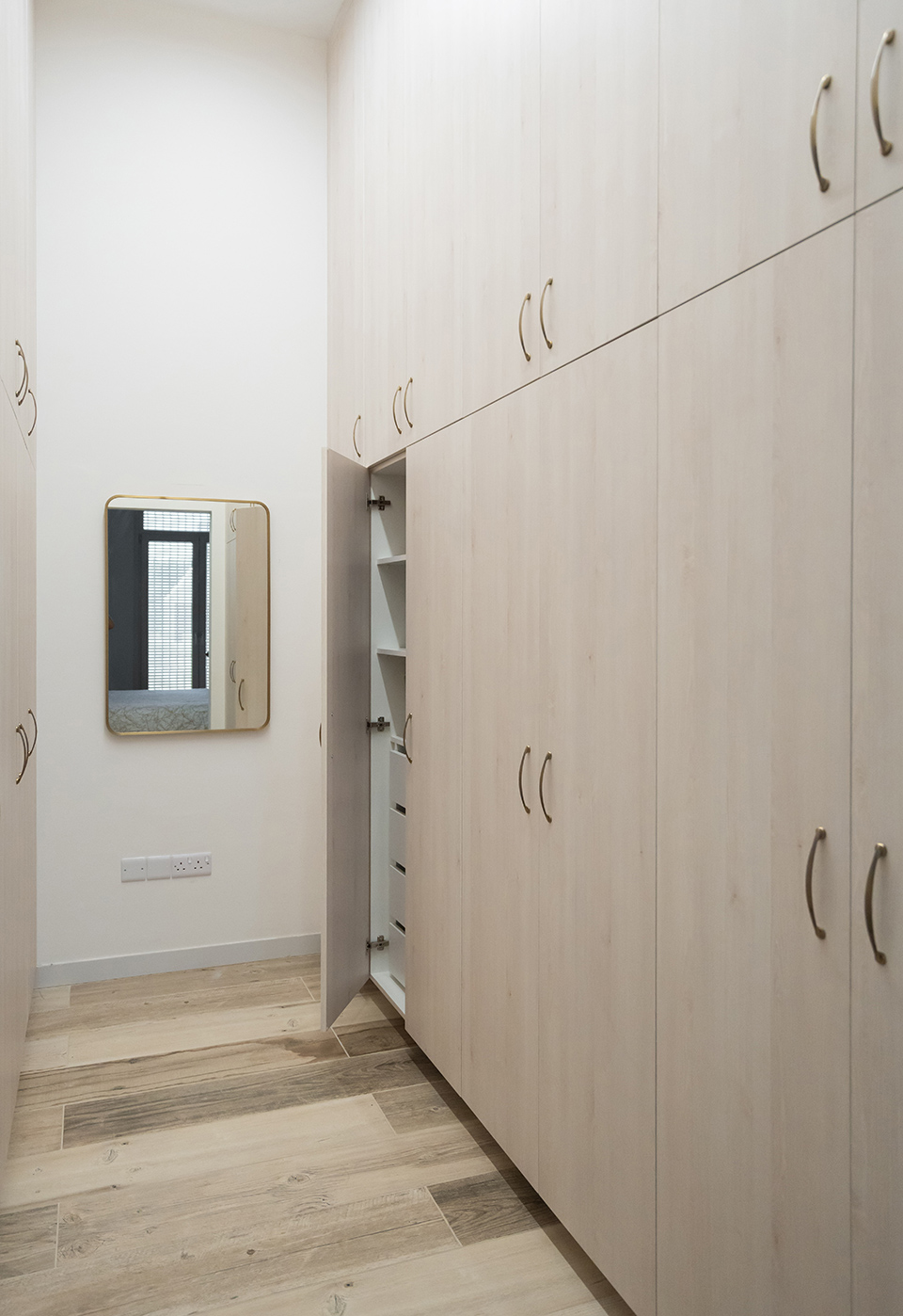 The wardrobes are crafted with laminate wood pattern board, in soft, earthy tones with clean lines and classic handles, covering the full height of the rooms.