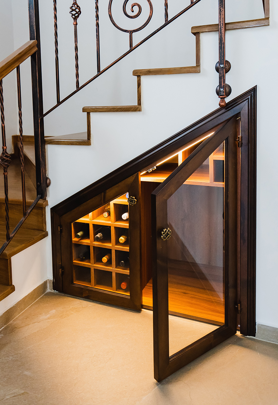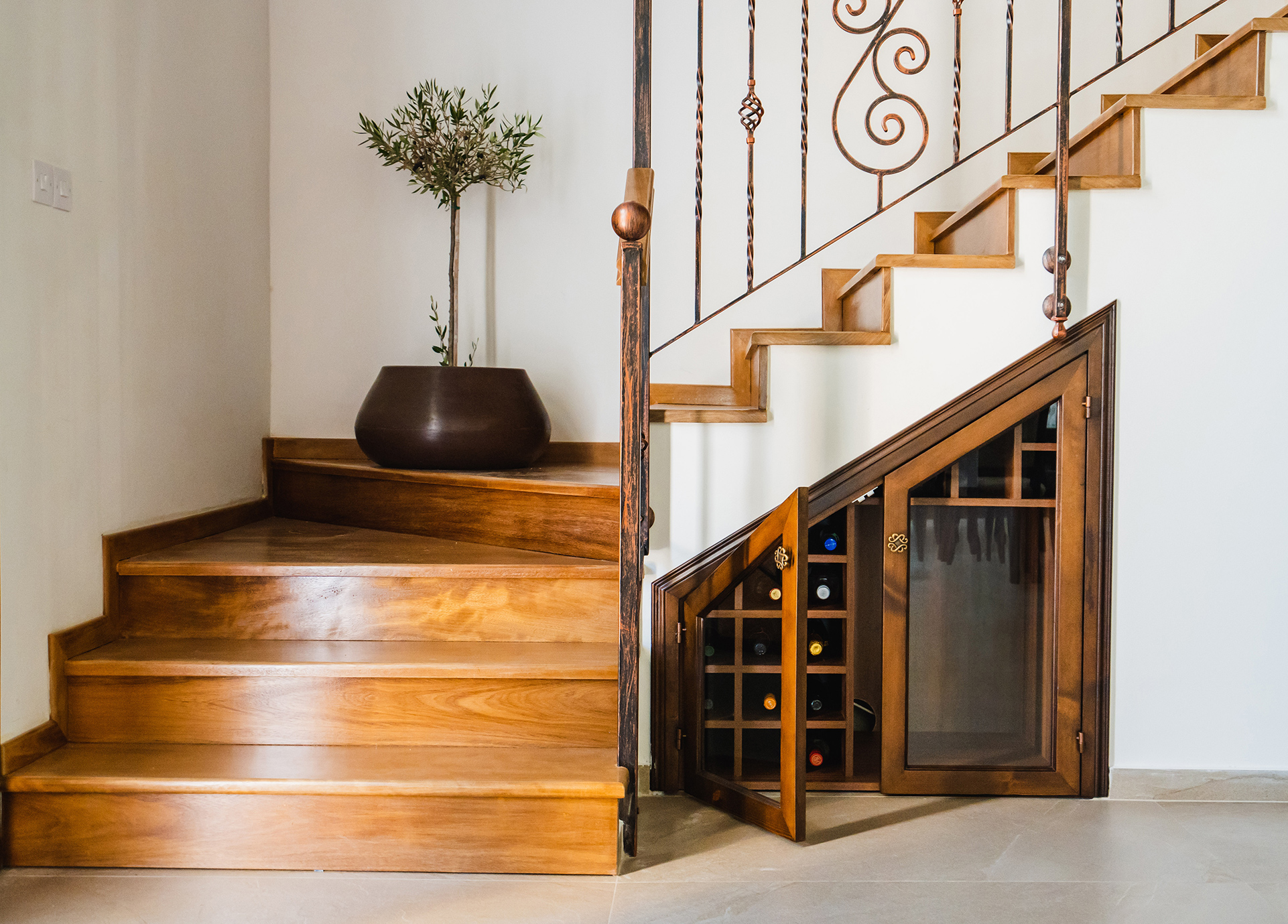This home features custom carpentry in key areas, including the staircase, kitchen, and wardrobes, blending natural wood tones with modern finishes for a warm and contemporary feel.