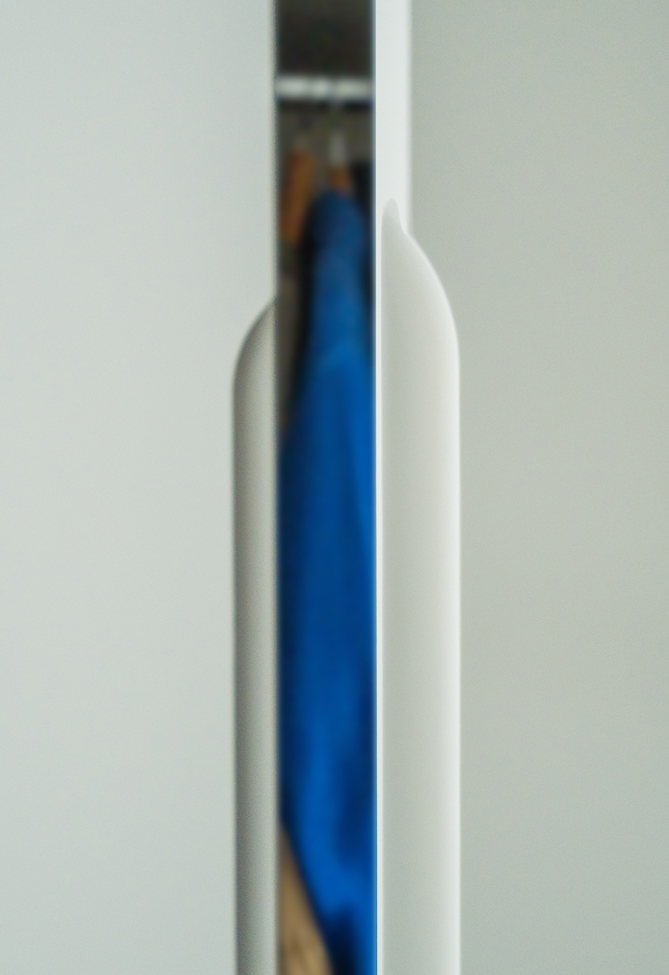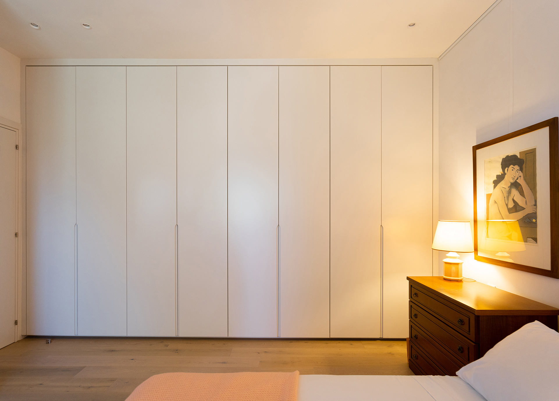 The bedroom is serene and well-organized, blending functionality with aesthetics. Large off-white wardrobes, made from MDF board, feature smooth matte doors with curved handles, maintaining a clean, minimalist look.