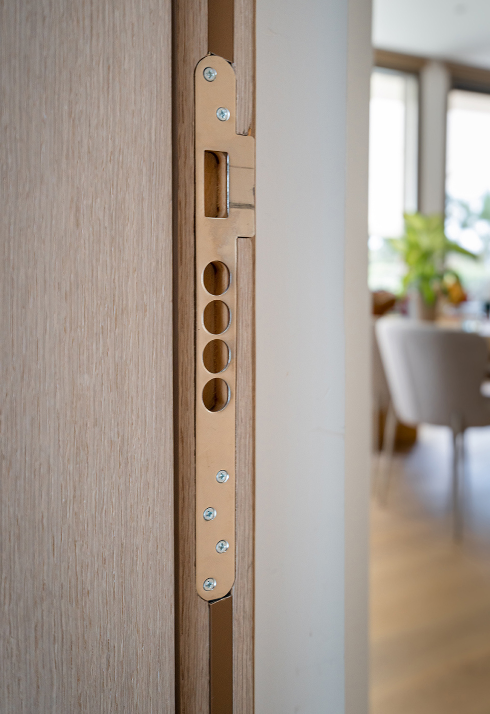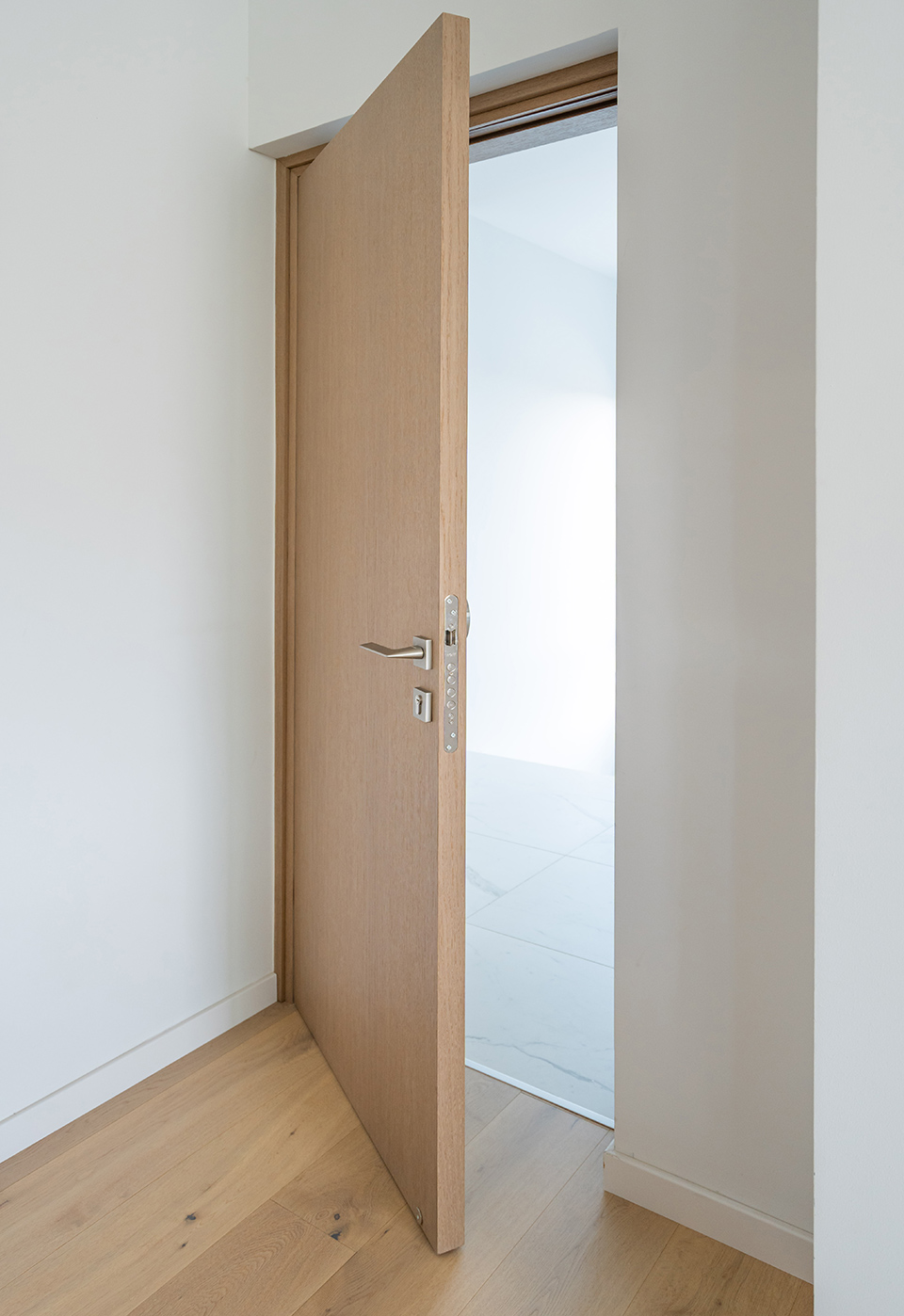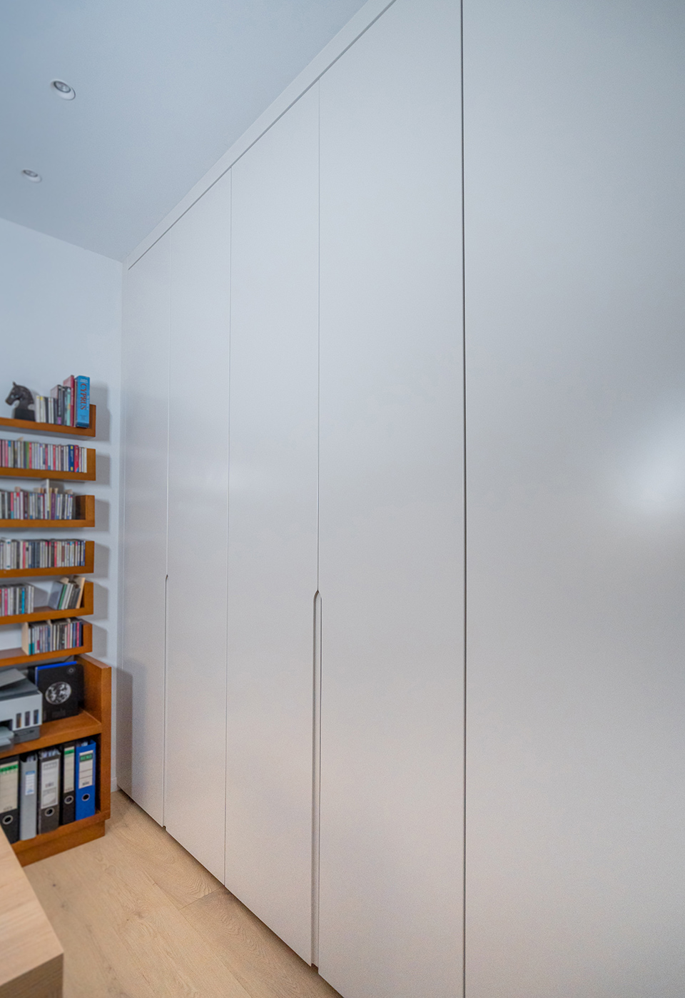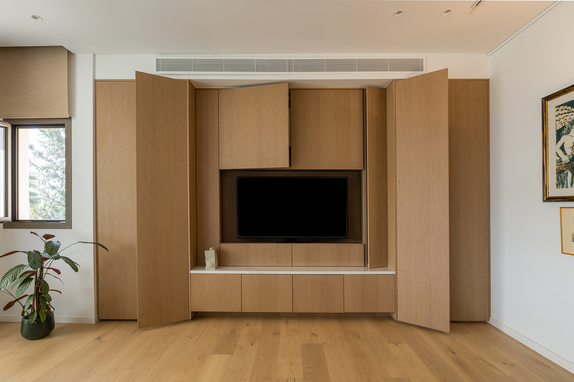 A built-in wooden entertainment unit serves as the living room’s focal point. Crafted from custom wooden boards with an ultra-matte lacquered finish, it creates a warm ambiance. Surrounding the television, handle-free wooden cabinets with push buttons offer storage without clutter. Below the TV, a white shelf with additional cabinets provides extra storage space.