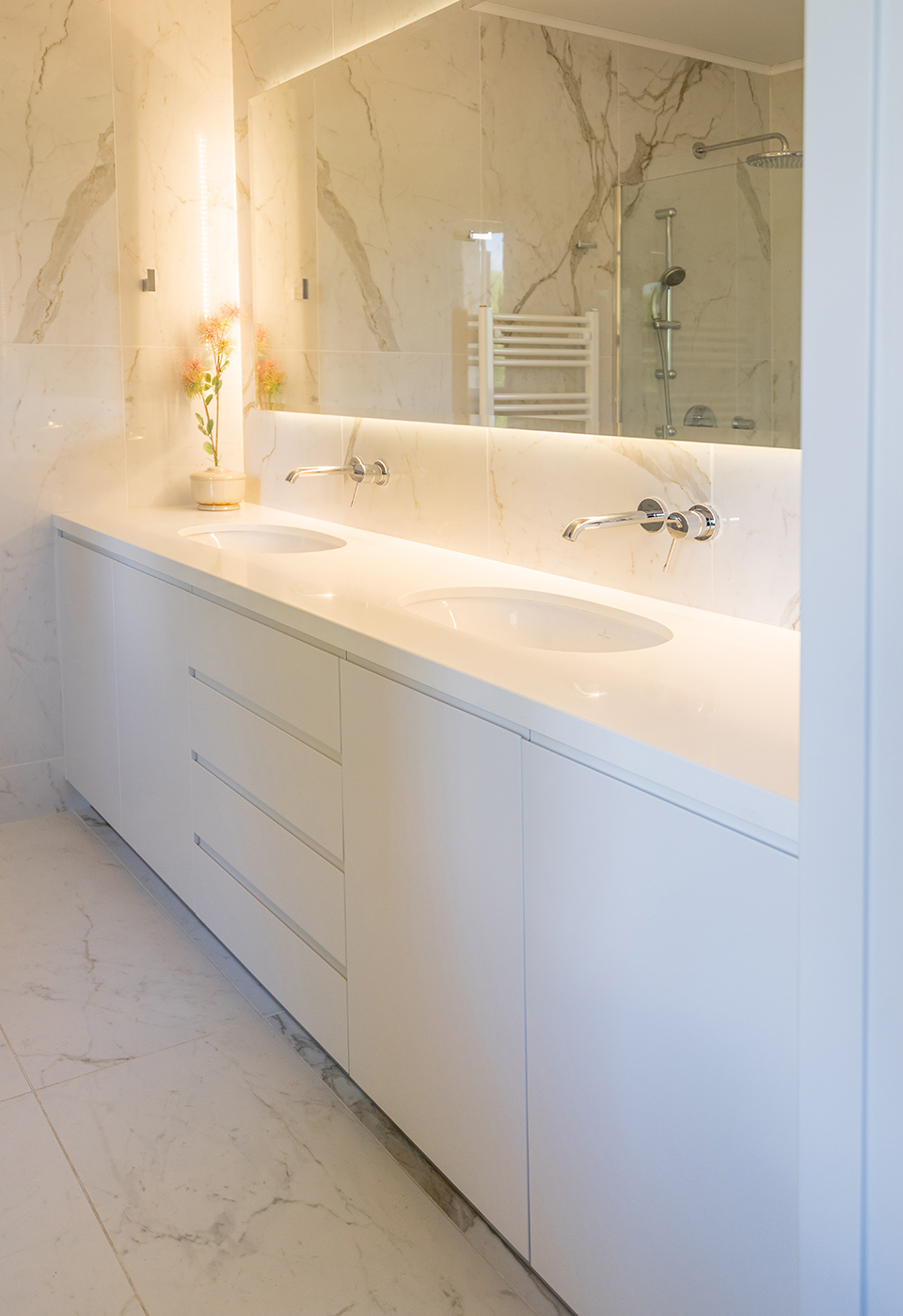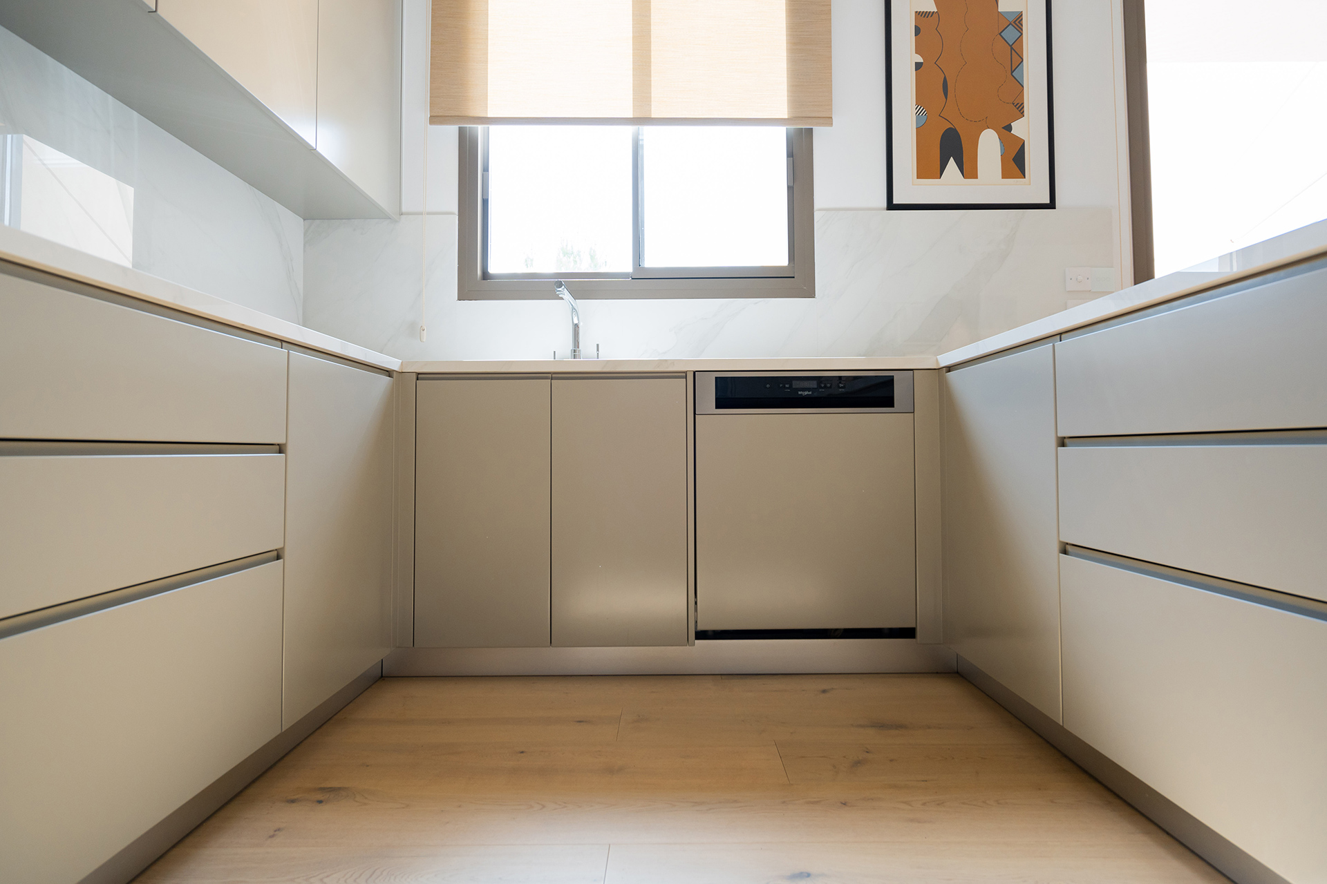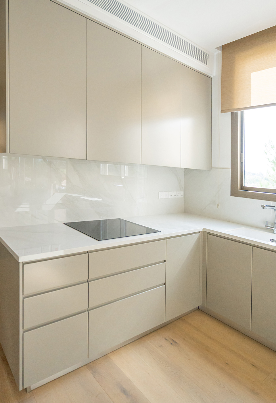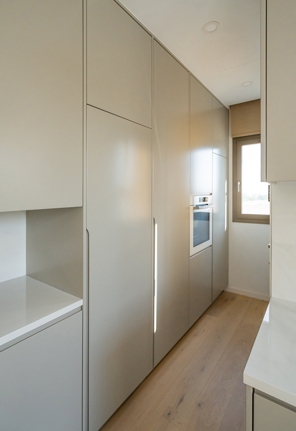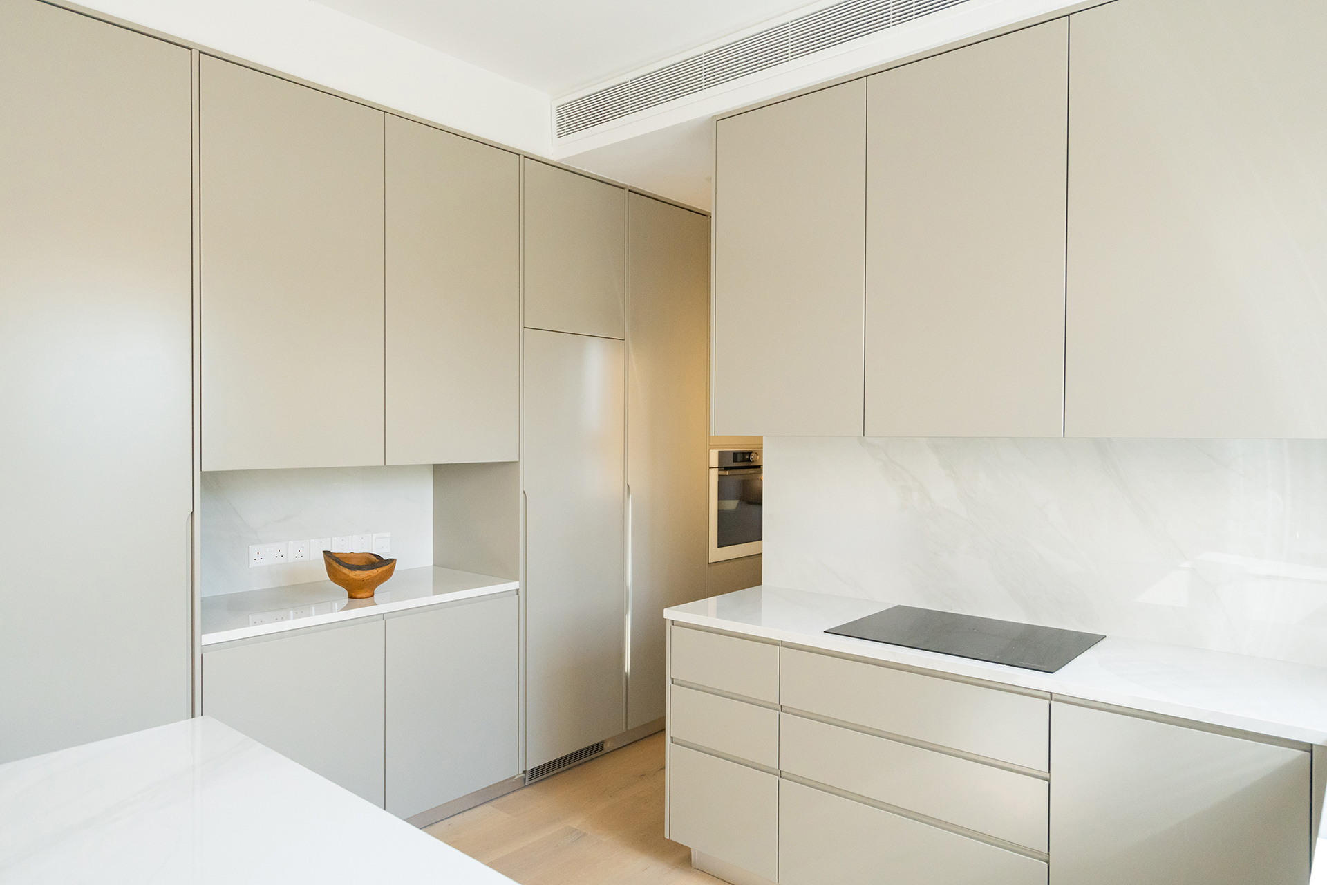 The open-plan living area features a modern “U”-shaped kitchen with an island and curved handles. Beige lacquered MDF board cabinets, offer ample storage while keeping a streamlined look. The built-in oven and induction cooktop are seamlessly integrated into the cabinetry, creating a cohesive, clutter-free appearance. The white countertops and marble backsplash add sophistication and luxury, while the integrated refrigerator and minimalist design enhance the open, airy feel. This kitchen balances style and practicality.